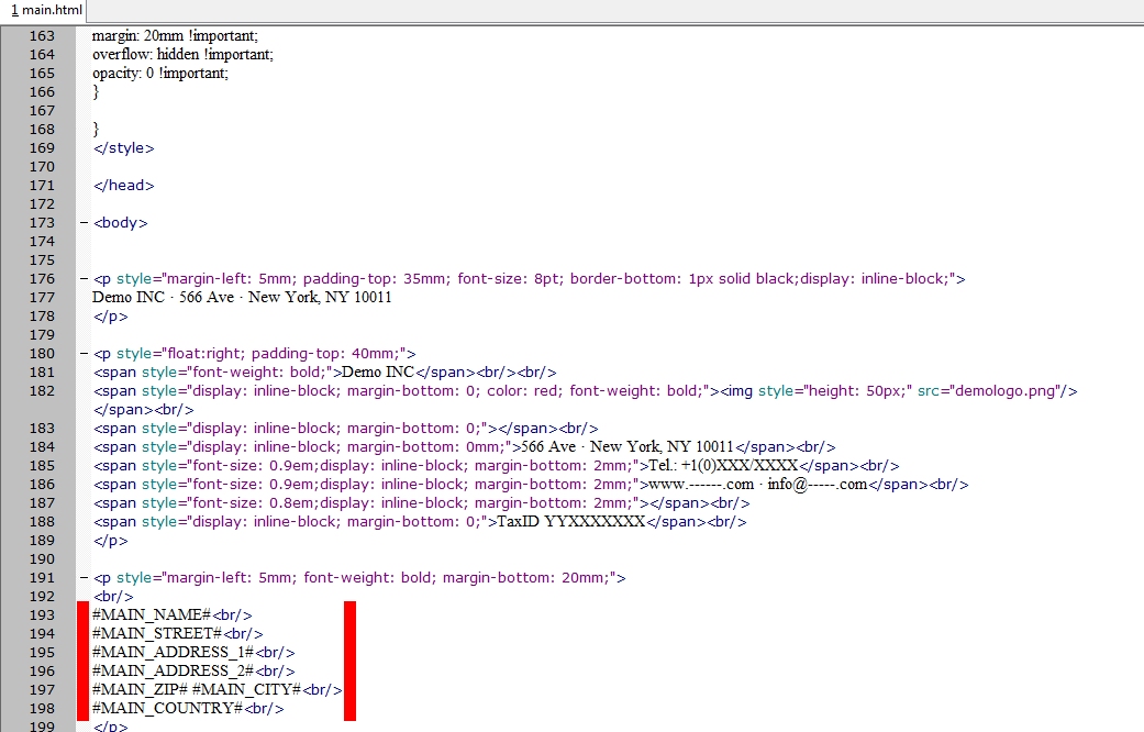 So gibt es beispielsweise die Spalten 'MAIN_NAME' und 'MAIN_STREET', welche entsprechende Parameter im HTML haben und dort mit dem Zeichen '#' kodiert sind. Daher ersetzt der Inhalt der entsprechenden Spalte 'MAIN_NAME', z.B. in der Excel-Importvorlage, bei der Erstellung der PDF-Datei '#MAIN_NAME#' im HTML. Wir schauen uns das mit einem einfachen HTML-Editor an, die entsprechenden Parameter sind rot hervorgehoben: